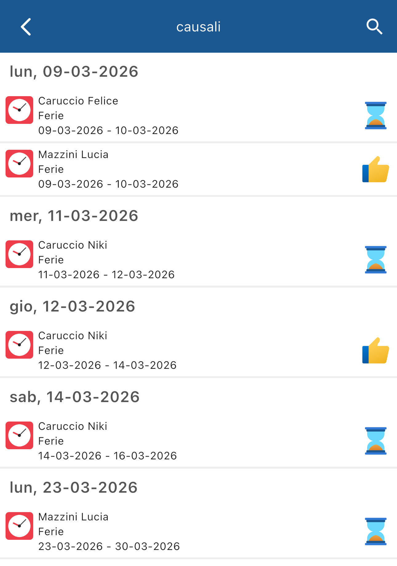 e apparirà la lista di richieste timbrature corrispondente: