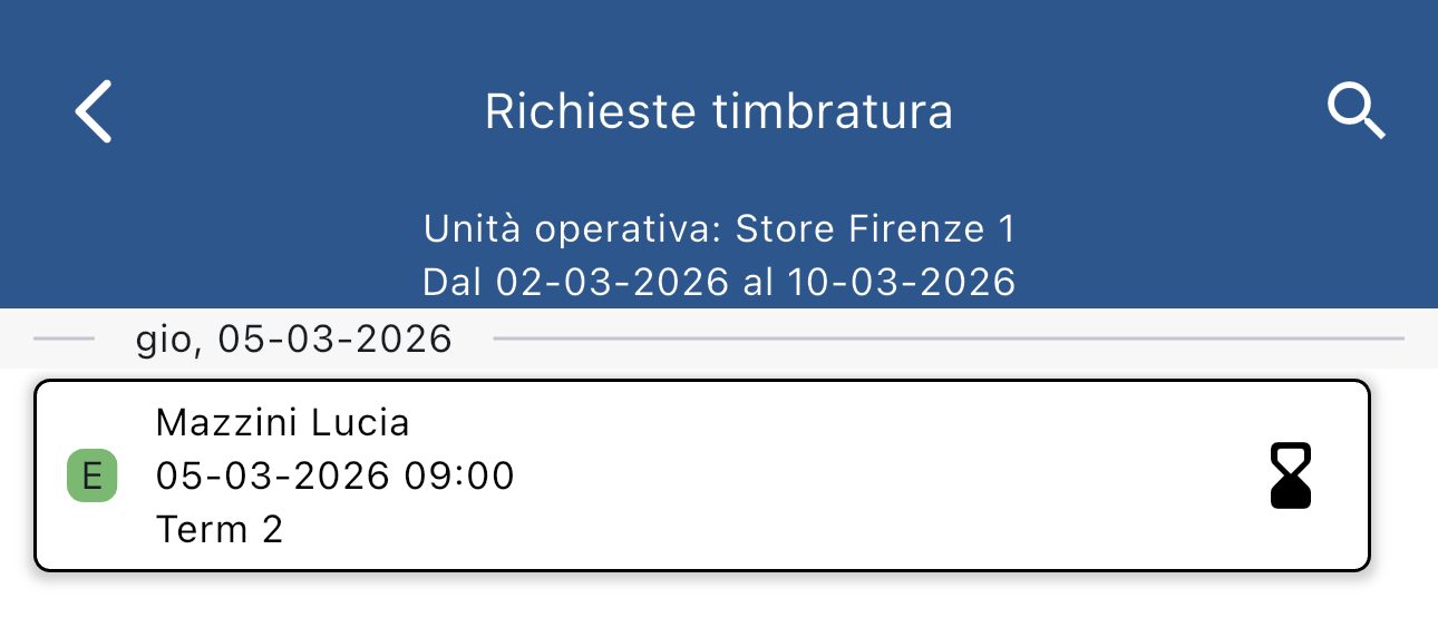 Toccando su una richiesta timbratura puoi vederne i dettagli:
