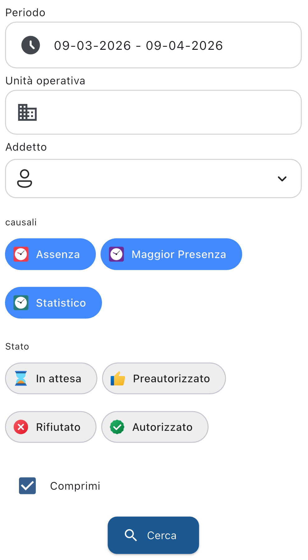 Dopo aver inserito il periodo, l'unità operativa, e l'addetto, tocca il pulsante
