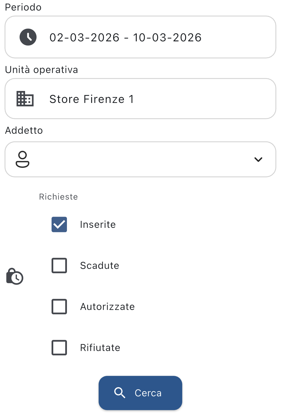 Con questa funzione puoi gestire le timbrature richieste dai tuoi addetti. Toccando Gestione Richieste Timbrature nella barra del menu vedrai una finestra che ti permette di cercare le richieste timbratura: