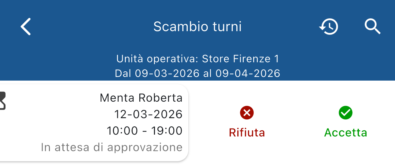Scorrendo verso sinistra su una richiesta appariranno i pulsanti per accettare o rifiutare la richiesta timbratura: