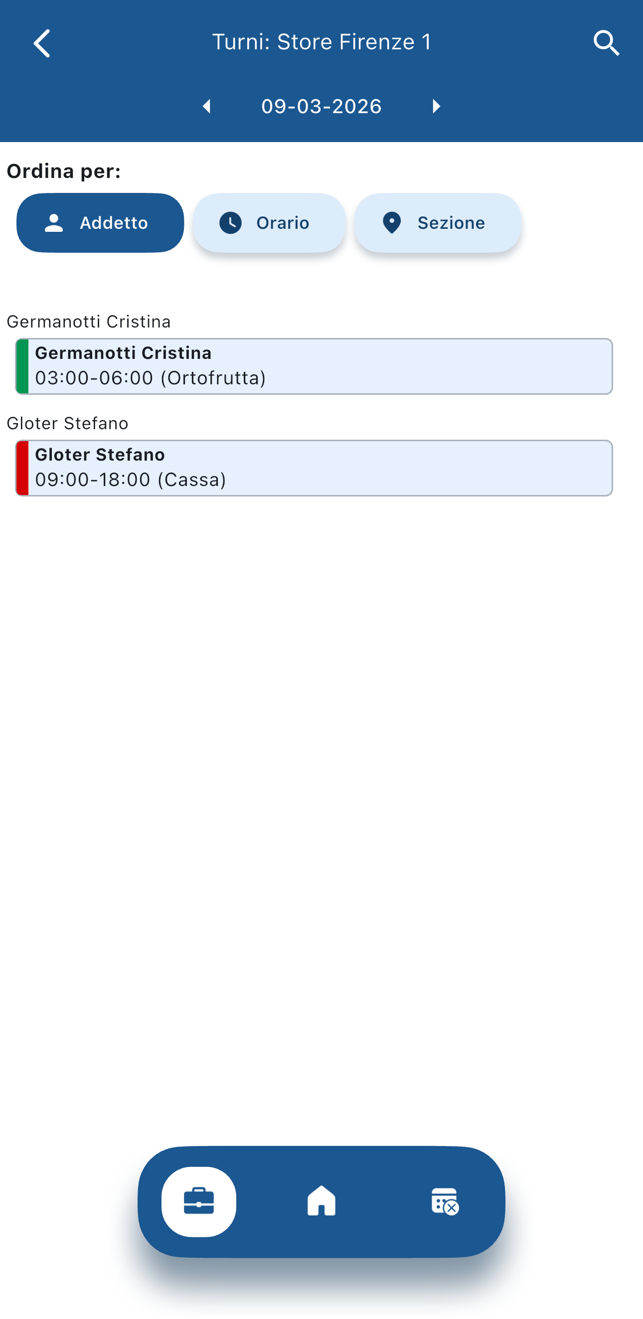 Una volta selezionata l'unità operativa vedrai questa schermata in cui vedi i turni per il giorno indicato nella parte alta dello schermo ordinati per addetto, ma puoi vederli anche per orario o per sezione con i pulsanti nella parte alta dello schermo: