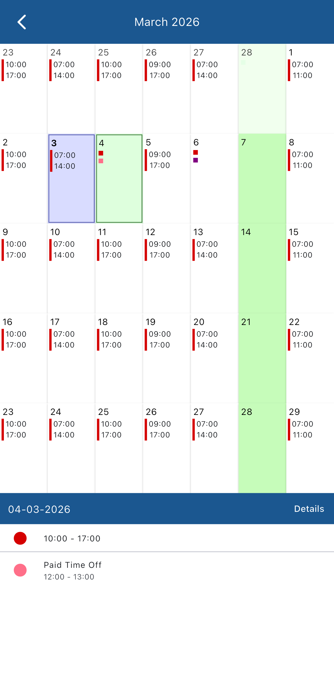 - Elements that cover part of a shift are represented as smaller squares in a day (you can see overtimes in purple on March 6th and absences in red on March 4th in the example screenshot above)